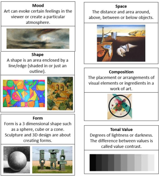 Formal elements of Art is taught through different media and materials as detailed below: